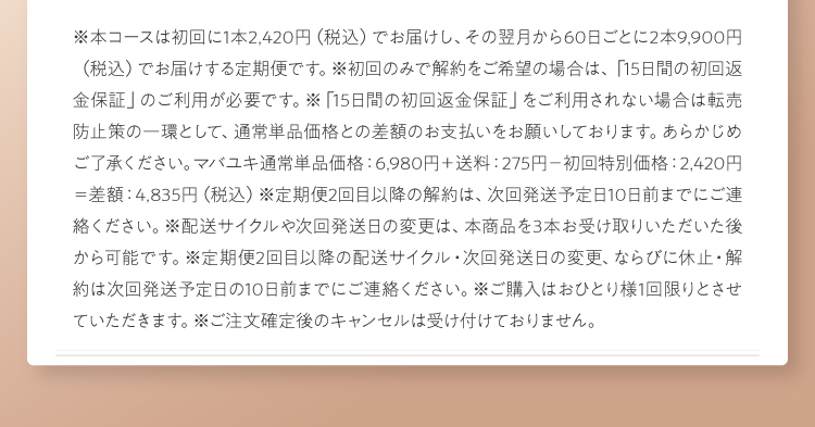 • ・初回返金保証を適応された場合、定期コースも同時に解約となります。